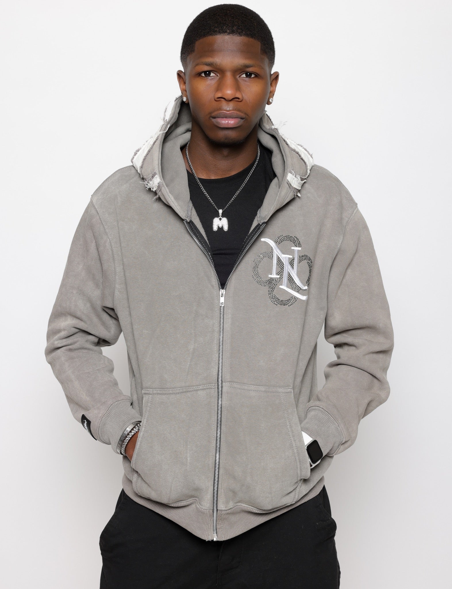 This sweater features a mix of grey tones, with each one carefully chosen for a, unique look. The slight pink spots are a result of an over-bleaching process, creating a, one-of-a-kind touch to the design. Made from a cotton and polyester blend , this hoodie is not only stylish but also warm and durable.